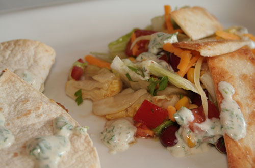 Den Salat mit Ranch-Dressing und Guacamole servieren. Dazu passen Quesadillas.