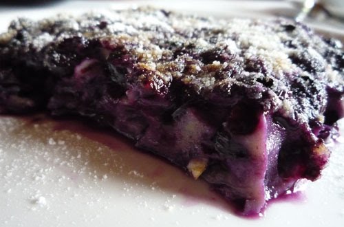 Den Teig auf ein Blech geben und die Blaubeeren zufügen. Im vorgeheizten Backofen bei 180°C ca. 30 Min. backen. Die Backzeit ist hauptsächlich von der Höhe des Auflaufs abhängig. Je kleiner und höher die Form, desto länger dauert es bis der Beermichel durch ist.
