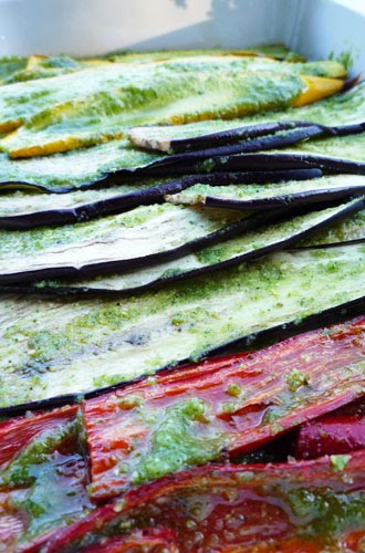 Das Gemüse z. B. mit der Brotschneidemaschine in 5 mm dicke Scheiben schneiden. Auf ein Rost legen und im Ofen bei 250°C für 10 Minuten von der einen und 5 Minuten von der anderen Seite grillen.