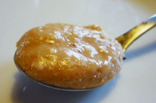 280 g Nüsse zusammen mit dem Salz und Zucker in einen Mixer geben und mahlen. Bei Bedarf noch etwas nachwürzen. Die Nüsse solange mahlen bis aus dem Pulver durch Austreten von Öl eine klebrige, aber geschmeidige Masse wird. Dabei sollte man darauf achten, dass die Masse nicht zu heiß wird. Der Vorgang kann je nach eingesetzter Maschine 3-10 Minuten dauern.