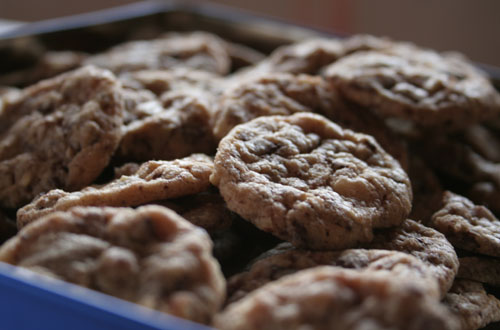 Gute Cookies sind voller Schokolade und Nüsse und schmecken „chewy“. Und genauso werden sie mit diesem Rezept. Variieren kann man dabei zum Einen die Schokoladensorte (z. B. Zartbitter, Vollmilch, weisse Schokolade, Karamell) und die Nüsse (z. B. Pecan, Haselnuss, Mandeln, Erdnüsse).