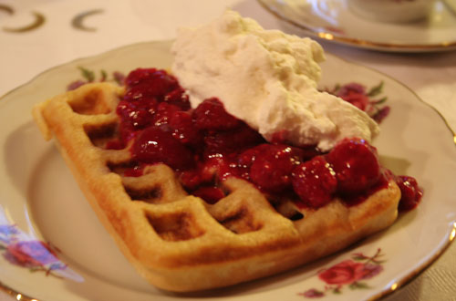 Die Waffeln mit Puderzucker bestäuben oder mit Sahne und Früchten servieren.