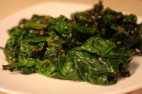 Den Sesam in einer Pfanne ohne Fett rösten, in eine Schüssel geben und beiseite stellen. Das Öl in der Pfanne erhitzen. Den frischen Spinat zugeben und 2-3 Minuten braten bis der Spinat zusammengefallen ist. Die Sojasauce und den Sesam zugeben und kurz (1 Min.) weiterköcheln bis die Sojasauce verdampft ist. Beiseite stellen und auskühlen lassen.
