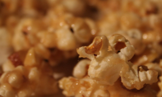 Für das Karamell die Butter mit Zucker und Honig bei mittlerer Hitze in einer Pfanne aufschmelzen bis der Zucker sich aufgelöst hat. Nun die Mischung aufkochen lassen und unter Rühren weiter köcheln lassen, bis die Mischung goldgelb ist. Die gehackten Nüsse unterrühren und die Mischung vom Herd nehmen. Nun das flüssige Karamell über das Popcorn verteilen und solange rühren, bis das Karamell gleichmäßig verteilt ist. Das noch warme Popcorn auf einer Lage Backpapier ausbreiten und abkühlen lassen. Bei Bedarf auseinanderbrechen und servieren.