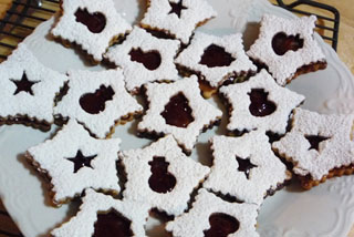 Nach dem Auskühlen die Hälfte der Plätzchen mit dem Loch auf ein Kuchenrost legen und dick mit Puderzucker bestäuben. Die restlichen Hälften mit Gelee bestreichen und mit je einer gezuckerten Hälfte belegen.
