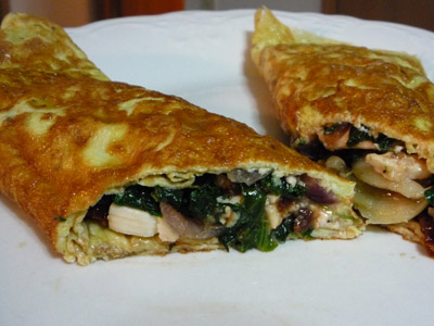 Die Eier mit Salz, Pfeffer und italienischen Kräutern schaumig rühren. Das Wasser zugeben. In der Pfanne etwas Kokosöl erhitzen und ein Viertel der Eimasse dünn darin verteilen. Sobald das Ei zu stocken beginnt (wenige Sekunden), ein Viertel der Spinatmasse auf das Omelett geben. Die Masse sollte in einem Streifen etwas ausserhalb der Mitte der Pfanne platziert werden. Nun die schmalere Seite der Eimasse über den Spinat schlagen und mit ein oder zwei schiebern unter die Rolle fassen und drehen. Nun ist nur noch ein kleiner Teil der Eimasse unbedeckt. Ebenfalls kurz stocken lassen und wärmen, bis der Feta schmilzt. Die gleiche Abfolge wiederholen, bis alle 4 Wraps fertig sind.