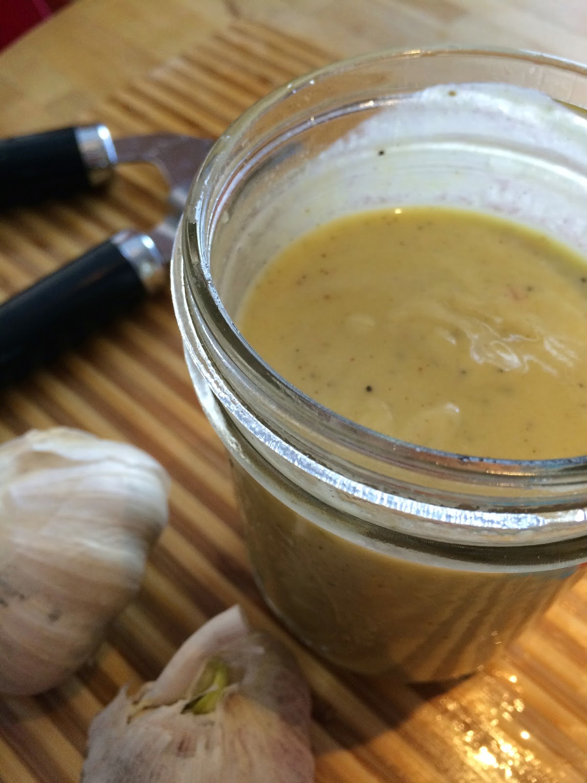 Den Knoblauch schälen und sehr fein hacken oder durch eine Knoblauchpresse drücken. Mit den restlichen Zutaten zu einer geschmeidigen Sauce verrühren.Das Dressing kurz vor dem Servieren über den Salat geben.