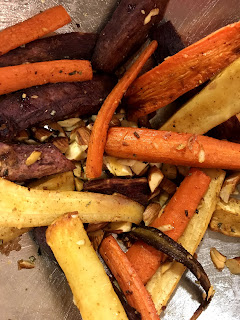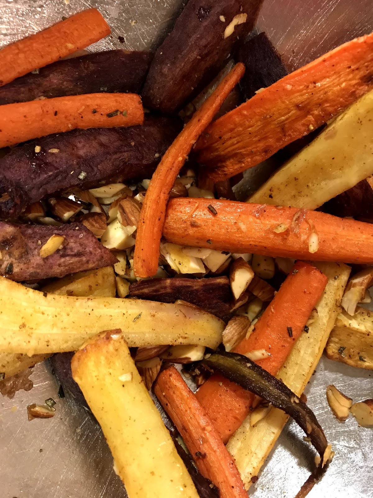 Diese Gemüse haben einen leicht süsslichen Geschmack, der durch das Braten im Ofen noch verstärkt wird. Am liebsten habe ich lila Süsskartoffeln, die aus Hawaii stammen und auch in Kalifornien zu kaufen sind. Es kann aber sein, dass es sie noch nicht überall gibt.